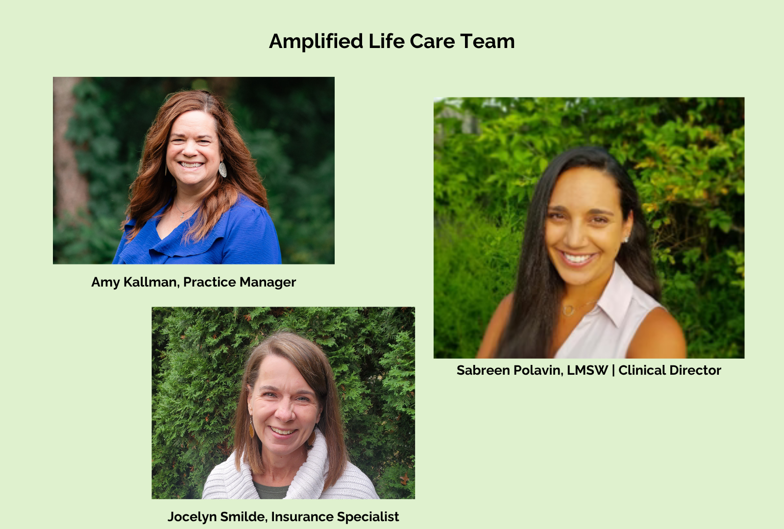 Amplified Life's Care Team includes Amy Kallman, our Practice Manager, Jocelyn Smilde, our Insurance Specialist, and Sabreen Polavin, LMSW, our Clinical Director. Our team works together to provide each and every person who reaches out to Amplified Life with a personalized approach. We understand it's not always easy to make the call to ask for help. Our team stands ready to answer your call, take time to learn about your specific needs, and expertly help you access the therapist and services that are right for you. Call 616-499-4711 or email us at care@amplife.com and let us help you today.
