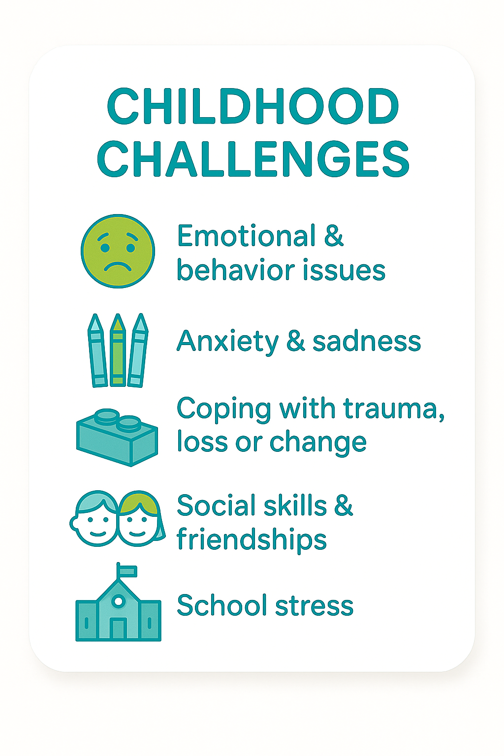 Amplified Life's child counseling therapists work collaboratively with family members, school social workers and others to ensure coordination of care. Our therapists and Care Team is highly experienced in working with:
