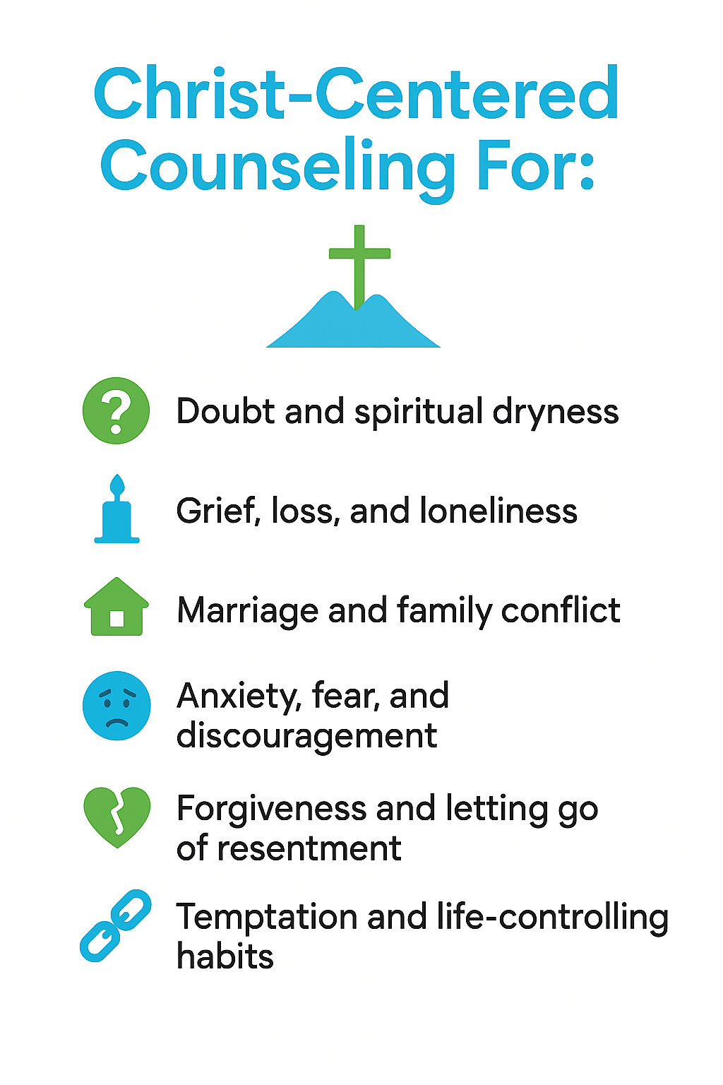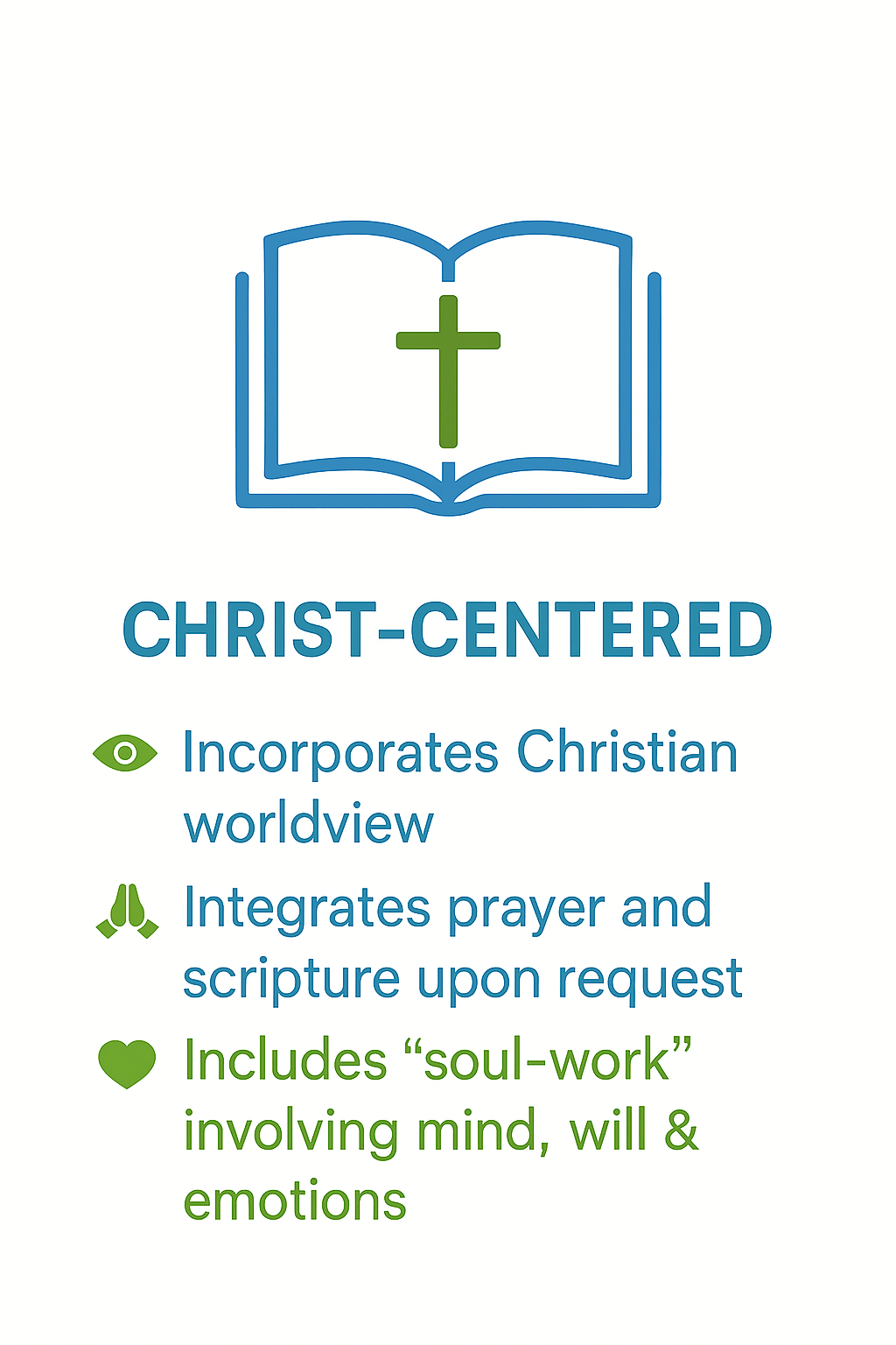 Our whole-person, Christian counseling approach integrates faith and clinical excellence. Your counselor attends to mind, body, and spirit, combining evidence-based therapies with biblical wisdom, prayer, and Scripture upon request. We explore habits that support wellness—sleep, movement, nutrition, and community—and help you apply Christian practices that cultivate peace, resilience, and purpose. Sessions move at your pace and respect your denominational background. The goal: practical progress that strengthens emotional health and deepens your walk with Christ in daily life.