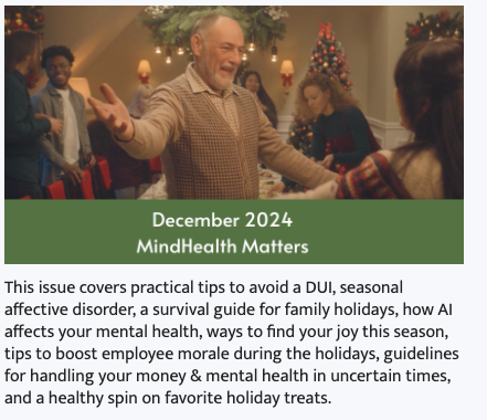 Learn MoreThis issue covers practical tips to avoid a DUI, seasonal affective disorder, a survival guide for family holidays, how AI affects your mental health, ways to find your joy this season, tips to boost employee morale during the holidays, guidelines for handling your money & mental health in uncertain times, and a healthy spin on favorite holiday treats.