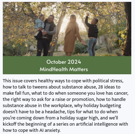 Check it outThis issue covers healthy ways to cope with political stress, how to talk to tweens about substance abuse, 28 ideas to make fall fun, what to do when someone you love has cancer, the right way to ask for a raise or promotion, how to handle substance abuse in the workplace, why holiday budgeting doesn’t have to be a headache, tips for what to do when you’re coming down from a holiday sugar high, and we’ll kickoff the beginning of a series on artificial intelligence with how to cope with AI anxiety.
